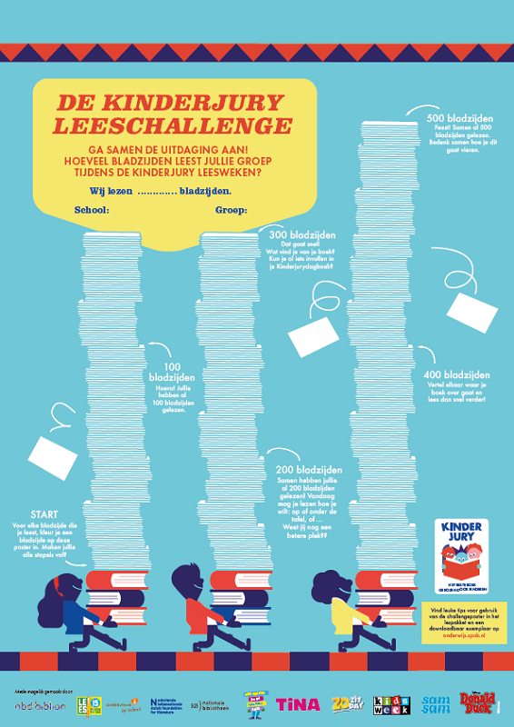 Dit jaar gaat de klas samen de uitdaging aan om zo veel mogelijk boeken te lezen! Houd de progressie bij door de Challengeposter in te kleuren per gelezen bladzijde. Deze vind je in het Kinderjury Lespakket of kun je hieronder downloaden. Hoe veel bladzijden gaan jullie lezen tijdens de Leesweken?