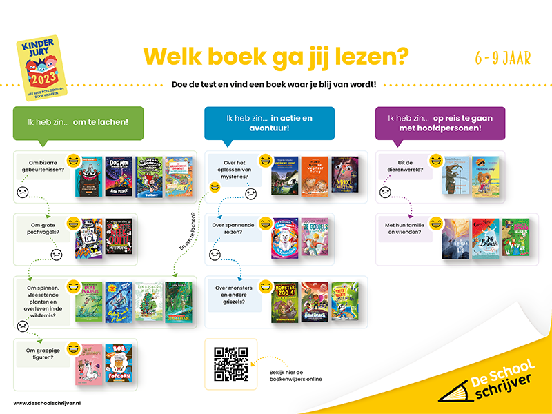 Met 25 titels per Tiplijst is er tijdens de Leesweken genoeg te kiezen. Welk boek past het beste bij welke leerling? Spannend, grappig, actief of avontuurlijk? Om daarachter te komen ontwikkelde De Schoolschrijver twee handige Boekenwijzers voor 6-9 en 10-12 jaar. Met behulp van deze Boekenwijzers vinden jouw leerlingen in een handomdraai hun volgende boek.